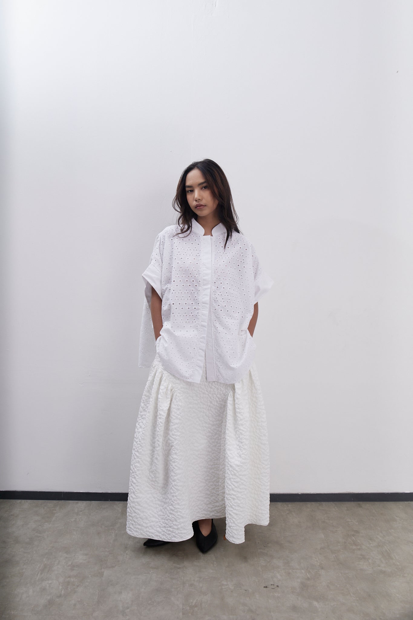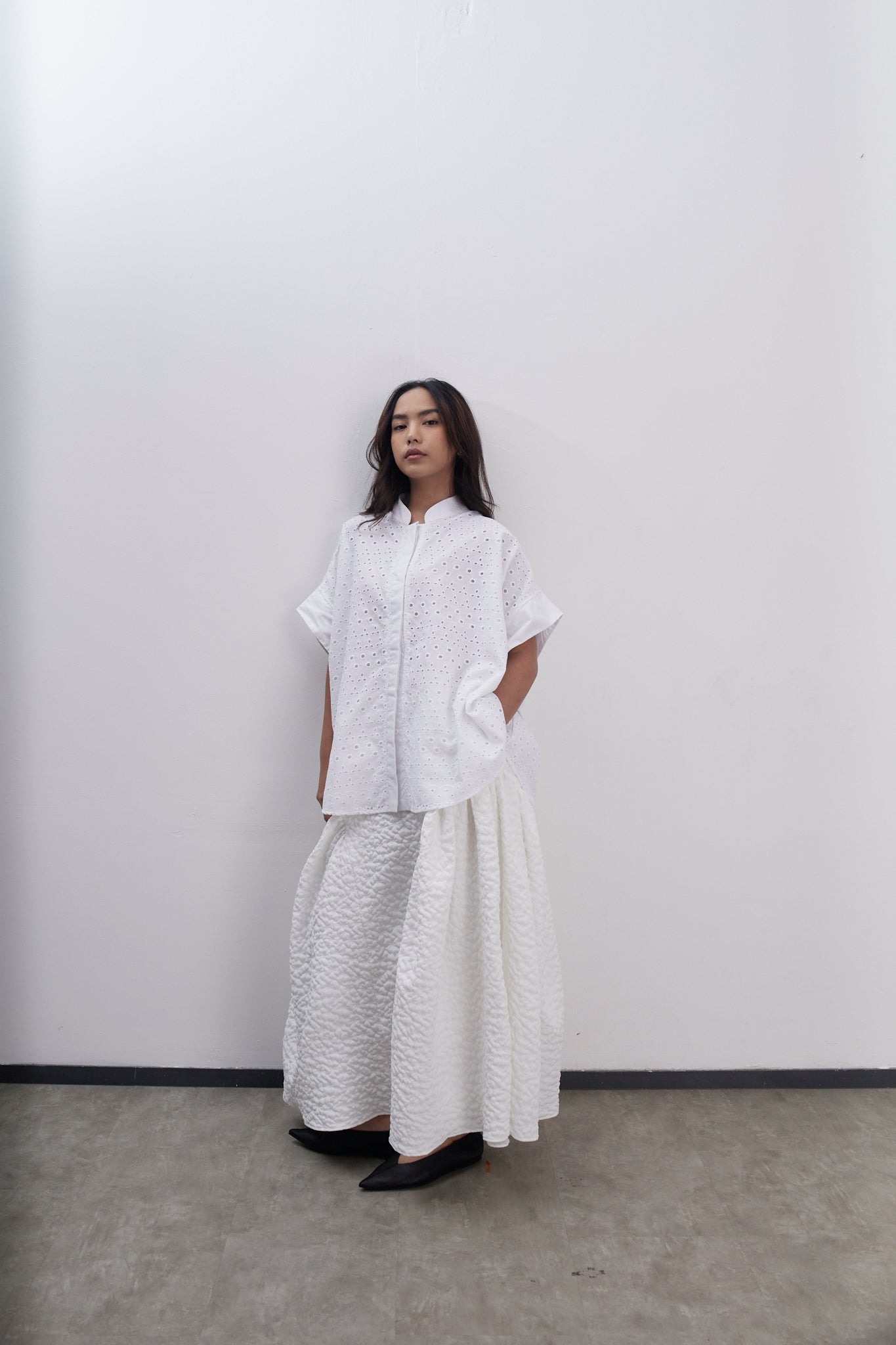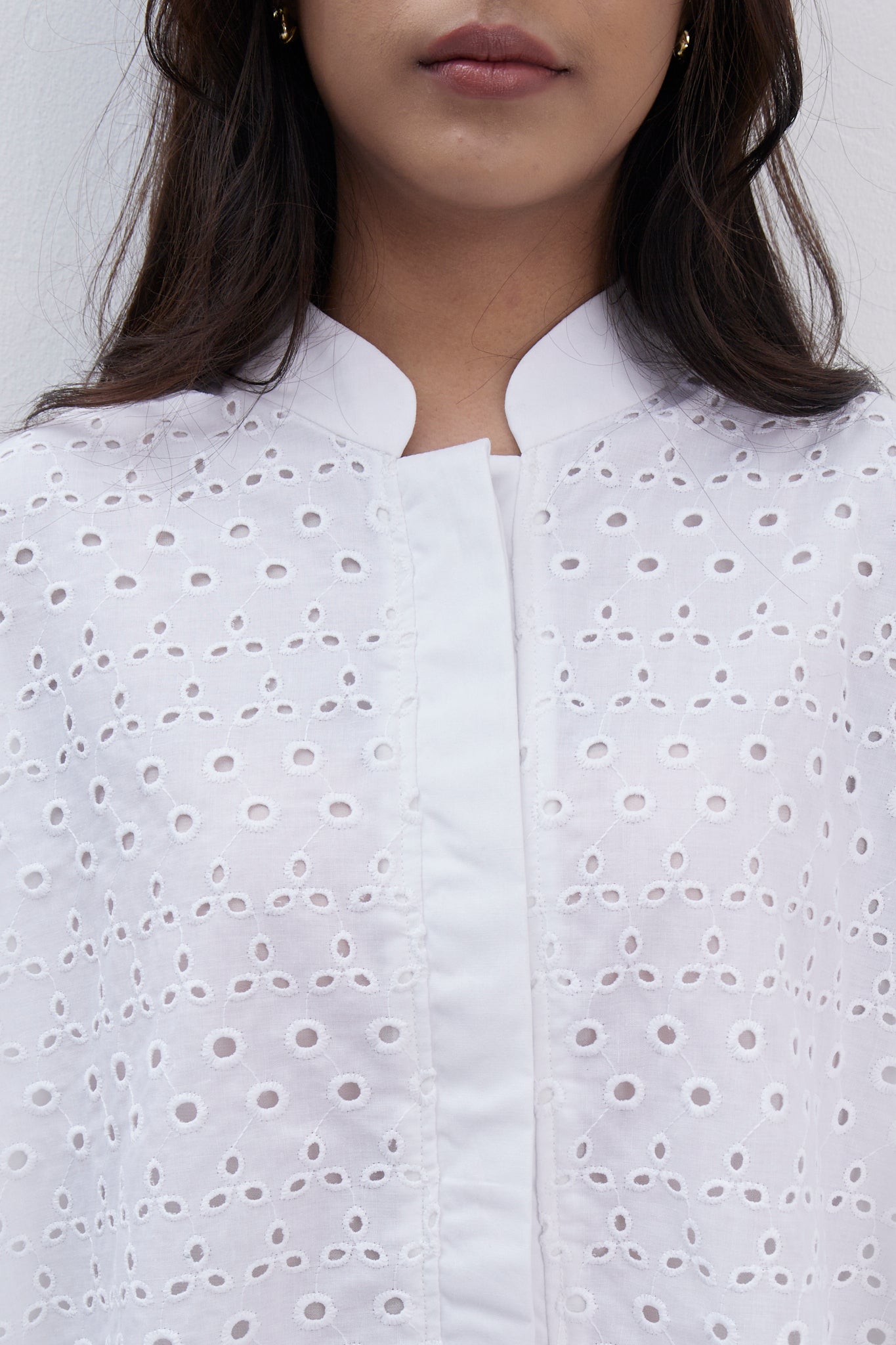 Chinese collar & hidden button placket combined with white plain fabric
